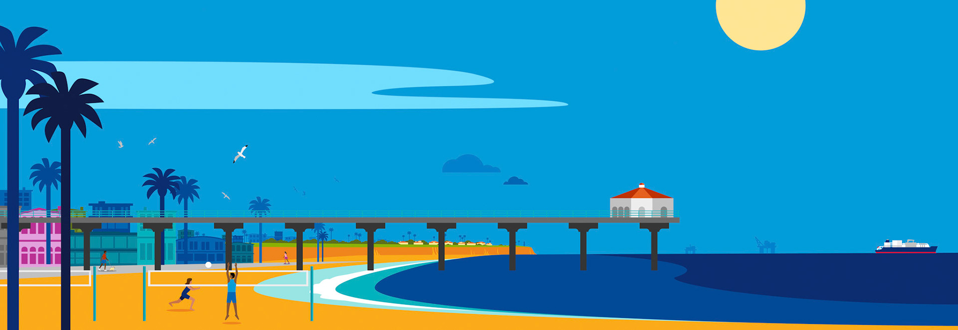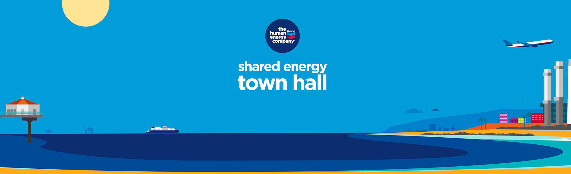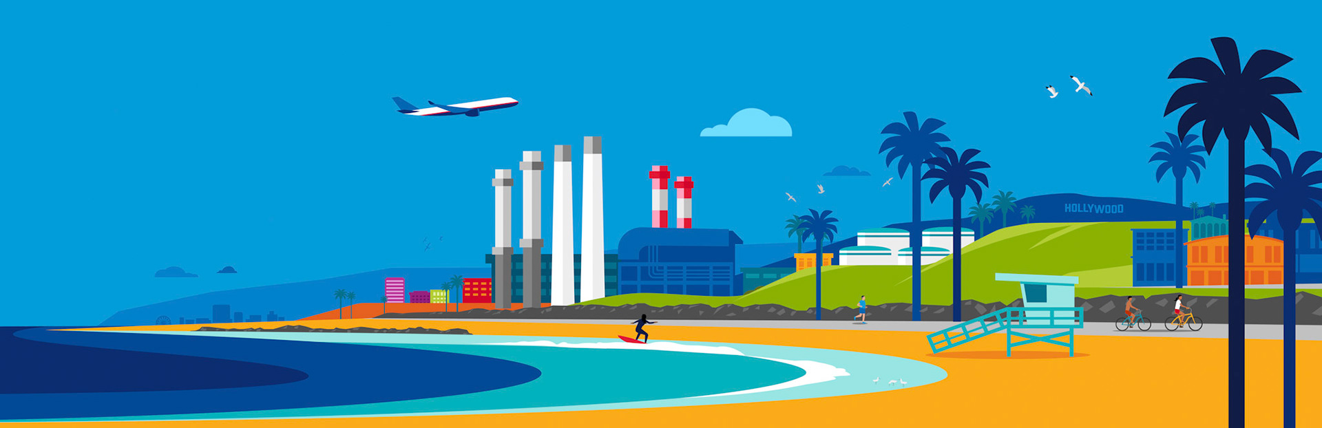 The client wanted a graphic illustration in the Chevron corporate illustration style that could be separated into smaller sections and be projected to fit a 33 foot backdrop for trade show presentations. The request was to include the Manhattan Beach/El Segundo, California environment, active people and industry related assets.